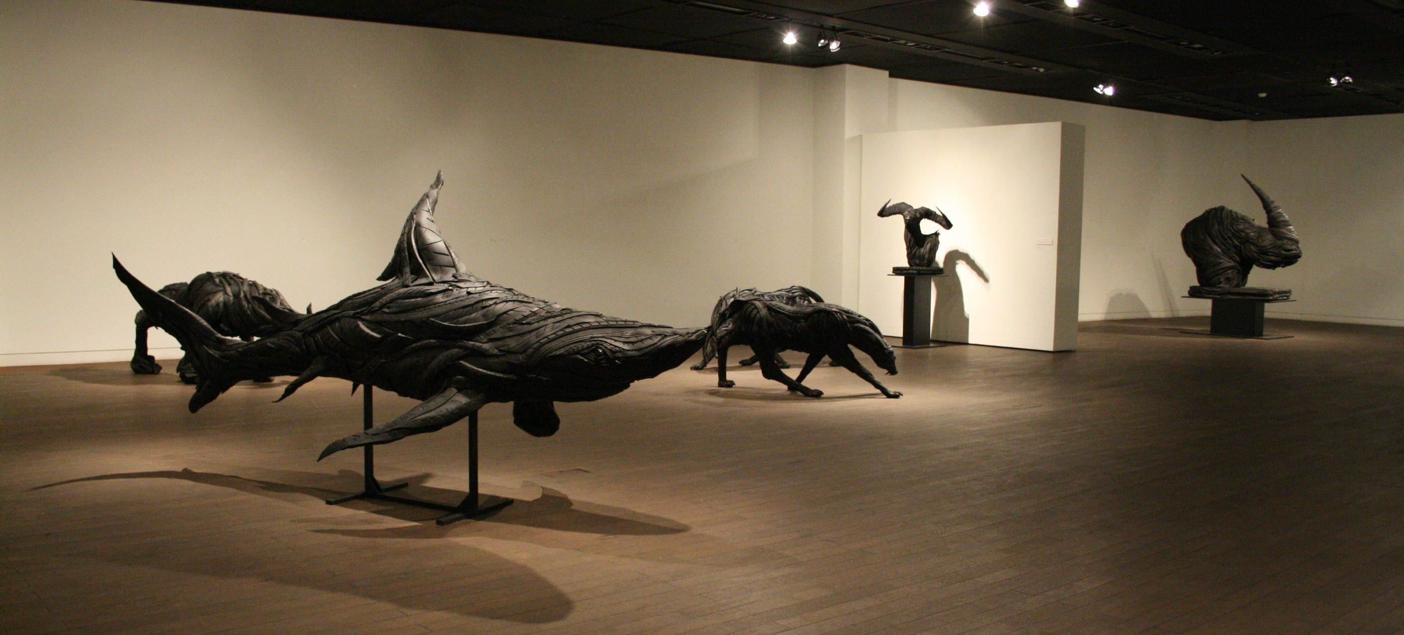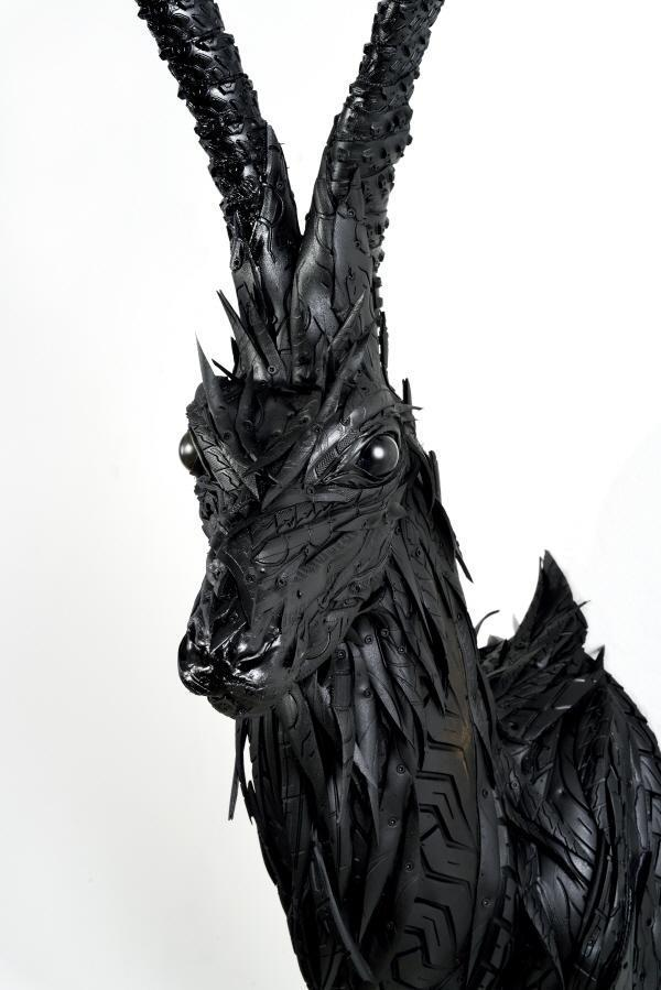 지용호 작가는 폐타이어를 소재로 하여 실제 동물의 모습과 작가의 상상 속에서 만들어진 생물체들을 역동적인 모습으로 표현한다.